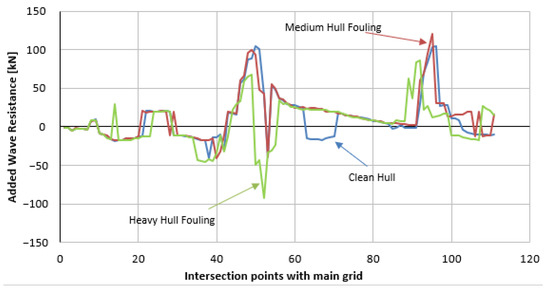 It has already been mentioned that hull fouling acts on calm water resistance negatively (Figure 4). Calm water resistance in medium fouling conditions increases by about 25% compared with clean hull conditions, while a more than 50% increase is observed in heavy fouling condition.