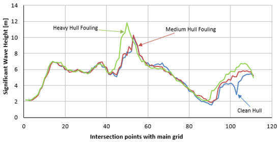 Prevailing significant wave height corresponding to optimum paths for different hull fouling conditions.