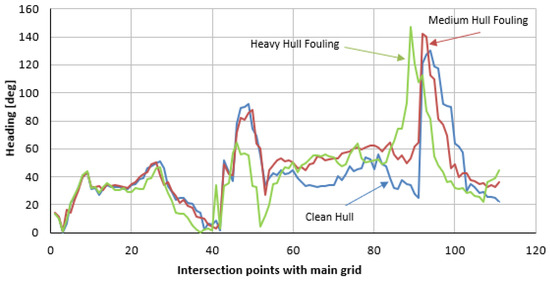 In Figure 11 and Figure 12 the significant wave height and the relative heading along the routes with clean, medium, and heavy fouled hull are shown along the corresponding optimal paths. Following seas are represented with 0 deg., whereas head seas are represented with 180 deg. While the algorithm seeks favorable current paths, especially in the heavy fouling condition, optimal path may pass through sea areas where the significant wave height is increased (around intersection point No. 50). Nevertheless, the corresponding relative wave direction refers to following or near followings seas, which results in negatively added wave resistance values. These negative values indicate that the added wave resistance component positively impacts the total resistance of the vessel.