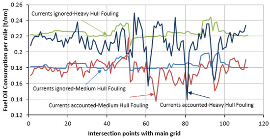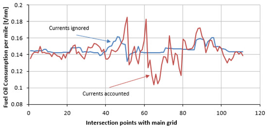 Next, whether sea currents affect the route selection and counteract hull and propeller fouling is examined. As already mentioned, currents have been considered by correcting the speed through water value when calculating calm water resistance. A new optimization is performed but, in this case, the currents’ effect is ignored. In Figure 13, a comparison between the optimal path found previously and the newly derived optimal path found without considering sea currents is presented, where both cases refer to the clean hull condition. When currents are considered, fuel oil consumption per nautical mile is significantly affected, as shown by intensive fluctuations (Figure 13). Moreover, fuel oil consumption is estimated to be about 345.8 t when considering currents, while 355.3 t is estimated when currents are ignored. The two different optimal paths are shown in Figure 14.