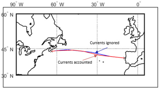 Optimal paths with (red route) and without (blue path) the currents’ effect.