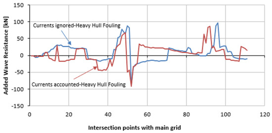 The fluctuations shown in Figure 13 are more noticeable when the hull is fouled and specifically when the heavy fouling condition is considered (Figure 15). This occurs because the optimization algorithm seeks favorable current paths (Figure 16) in order to decrease calm water resistance, which is extremely high and finally finds a path that requires 528.2 t of fuel instead of 540.6 t when currents are ignored. In Figure 17, the added wave resistance along the estimated optimal routes with and without the currents’ effect under heavy fouling conditions is shown. When currents are ignored and speed remains constant, the major component for the minimization of fuel oil consumption and consequently for the minimization of the total resistance is the added wave resistance. This means that the algorithm seeks the optimal solution while trying to find a path where the significant wave height is low and/or where following seas are dominant. The two optimal paths for heavy fouling conditions with and without currents are shown in Figure 18.