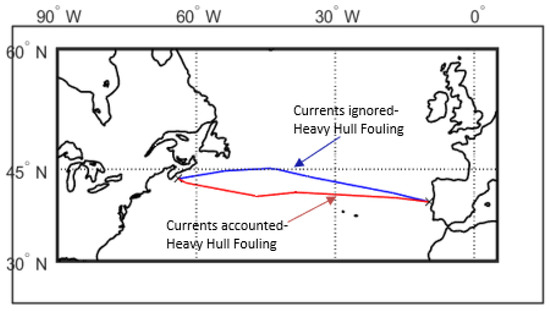 Optimal paths with (red route) and without (blue path) the currents’ effect under heavy hull fouling conditions.
