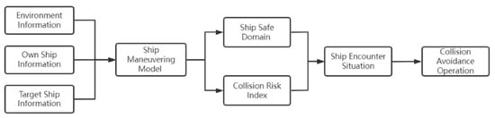 Autonomous ship CA decision is made from the perspective of safety, navigation practice, and regulations, using appropriate mathematical methods to determine CA measures, with the most dominant form being an optimal combination of altering course and changing speed simultaneously. In order to do this, as shown in Figure 1, the information of the navigation environment, the own ship, target ships, and other dynamic obstacles should firstly be collected, processed, and modeled to conduct a mathematical model of ship motion [5,13,14,15]. Additionally, according to the indicators of ship domain [16] and collision risk [17,18,19,20,21], and the identified complex ship encounter situations constrained by the COLREGs [22,23,24,25], sequential and proper CA actions are made to maintain a safe distance [26,27] between the own ship and target ships/obstacles to avoid collision.