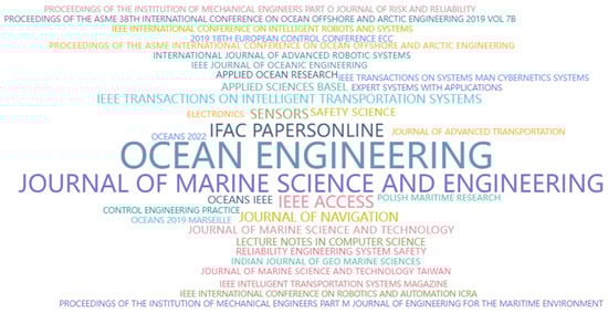 The sources of publications for the collection of the literature are shown in Figure 3: papers related to ship CA research are published in “Ocean Engineering”, “Journal of Navigation”, “Journal of Marine Science and Engineering”, and other nautical journals, and, in recent years, research on autonomous ship CA has rapidly increased. Research on autonomous CA is not limited to open waters, but includes more complex waters, such as narrow waterways. For illustrative purposes, a journal title’s size indicates the relative number of papers published in that particular journal.