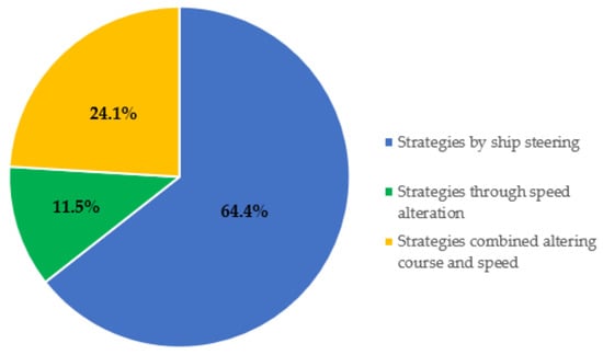 According to navigation practices, there are four options for CA actions: (1) altering only the course; (2) altering only the speed; (3) altering the course and speed simultaneously; and (4) keeping the course and speed (the actions of stand-on vessels are not considered in this study) [46]. Most early autonomous CA algorithms alter the course to avoid collisions. Many studies plan the trajectory first and then control the ship to sail along the track, without including the control of speed; there are a small number of studies on autonomous CA based on speed alteration. As shown in Figure 4, a statistical analysis of the selected papers cited in this study shows that 64.4% of studies alter course for collision avoidance, 11.5% change speed for collision avoidance, and 24.1% combine alterations of course and speed for collision avoidance.