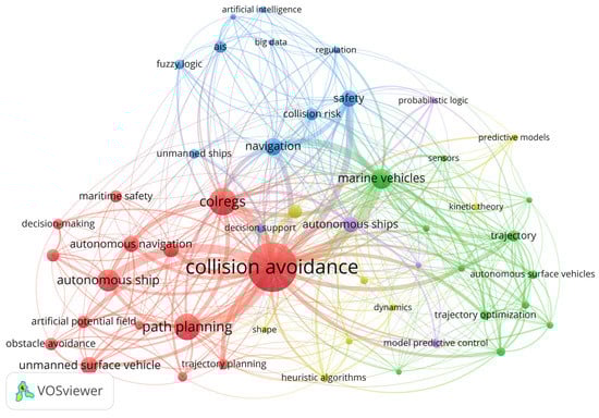 To better understand the development and the focus of automatic CA decision-making research in the literature, the abstracts of the selected papers were analyzed using the “VOSviewer” software, and the more popular research keywords are shown in Figure 5. The texts in assorted colors in the figure represent research hotspots in a chronological order. The size of the bubbles reflects the number of occurrences of the keywords in the literature, and the lines indicate their relevance to each other. These keywords indicate both the factors considered in the literature and the methodological or technical approach adopted, and they provide an overview of research on ship CA decisions in recent years. Early research has mainly focused on “own ship”, “COLREGs”, and “path planning”. Over time, many new buzzwords have emerged in CA research, such as “simulation”, “navigational safety”, “autonomous ships”, and “risk assessment”.