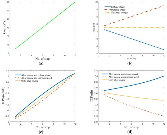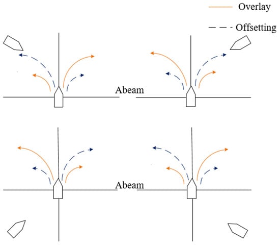 At all times, ship collision avoidance at sea is typically achieved by altering the course, changing the speed, or a combination of both. In open waters, considering the response time of a vessel and the sailing habits of a crew, altering the course is the primary method of collision avoidance. In restricted waters, collision avoidance is often combined with speed changes [7]. Regardless of the type of CA action, according to the COLREGs, following the “early, large, wide, clear” principle is recommended. “Early” means taking large evasive action early and making such an action in ample time. “Large” means substantial action, that is, the action taken to avoid collision needs to be large enough to be easily observed visually by other vessels or by radar. If vessels are in sight of one another, it is common to alter by more than 30° at a time. In poor visibility, it is often necessary to alter by more than 30° and determine the timing of the turn. Regarding speed, it is usually advisable to slacken to half of the original speed or stop [25]. “Wide” means that a CA action should avoid the emergence of a close-quarters situation. Altering courses in open waters is the most effective way to avoid a close-quarters situation. In restricted waters, such as narrow waterways, ship CA actions should be conducted in a timely and substantial manner [7]. “Clear” means that a CA action should be effective and ensure that the other vessel is finally past and clear [30]. The original route should be resumed after complete collision avoidance is successful [32].