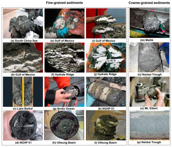 Hydrate formation is a complex physical and chemical process that can be divided into two stages: hydrate nucleation and hydrate growth [27]. Hydrate nucleation is a stochastic and heterogeneous process at the molecular level. Many hypotheses have been proposed to explain the hydrate nucleation process, including the labile clusters hypothesis, the local structuring nucleation hypothesis, the interfacial nucleation hypothesis, and the blob hypothesis [28,29,30,31,32]. The process of hydrate nucleation can be classified as homogeneous or heterogeneous. Heterogeneous nucleation occurs when impurities exist, which is the most likely phenomenon. After the nucleation stage, hydrates continue growing and exhibit different morphologies at the macroscopic level. The growth rate of hydrate depends on gas consumption, temperature, etc. As a result, the distribution of hydrates in sediments is complex. As shown in Figure 1, the hydrates in natural HBS cores within fine-grained sediments are shown as veins, lenses, and nodules, while those within coarse-grained sediments distribute in sediment pores and are not directly visible. The hydrate morphologies in sediment pores are categorized as pore-filling, cementing, load-bearing, grain-coating, and patchy. Figure 2 shows the coarse-grained HBS specimens synthesized in a laboratory. The hydrates in sediment pores are not single but a combination of two or more morphologies. Moreover, the hydrate saturations in different pores are different, resulting in an obvious distribution heterogeneity. The physical and mechanical properties of heterogeneous HBSs are less investigated than that of homogeneous HBSs. Liu et al. [33] synthesized hydrate-bearing sediment specimens with heterogeneous and homogeneous hydrate distributions using the sand-water mixing method. The results indicate that the hydrate distribution heterogeneity influences the mechanical properties of hydrate-bearing sediments. Therefore, the distribution heterogeneity of hydrates should be taken into account to accurately characterize the mechanical properties of hydrate-bearing sediments, which is fundamental to predicting the mechanical responses during hydrate exploitation.