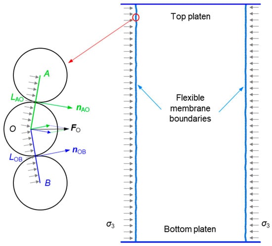 Flexible boundary conditions can capture the reasonable deformation behavior of granular materials in DEM simulations [48,49,50,51]. The HBS specimen with flexible boundaries is prepared as follows. First, the initial HBS specimen is consolidated to a small isotropic stress of 10 kPa under lateral rigid walls. Then, the lateral walls are replaced by membrane boundaries consisting of bonded membrane particles. Each membrane particle is constrained by its adjacent membrane particles, as shown in Figure 4. To maintain constant confining pressures during compression, the force applied to one membrane particle (e.g., Particle O) can be calculated by the following equation: