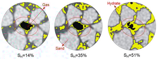 Figure 5 presents the hydrate formation process under excess-gas conditions in a pore based on the micro-CT technique. At a low hydrate saturation, hydrates grow around the interface between gas and water. Then, hydrates continue growing from the edge to the center of the gas area, and the pore volume decreases as hydrate forms. At a high hydrate saturation, hydrates can strongly cement the sediment particles. The cementing behavior induced by the cementing hydrates between sand grains is similar to glass beads cemented with epoxy, as shown in Figure 6. The cementing behavior can be described by the parallel bond contact model [46].