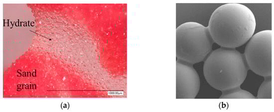 The cementing effect of hydrates on sediments. (a) Sand particles cemented by hydrates [60]; (b) glass beads cemented by epoxy [61].