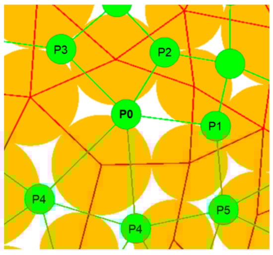Following the above hydrate formation process in a sediment pore, a conceptual model is proposed to describe the cementing hydrates between sediments. The cementing hydrates are uniformly distributed at the sediment–sediment contacts surrounding the pore, as shown in Figure 7a. The volume of hydrates determines the bond strength and stiffness of the sediment–sediment contact. The bonds are weak at low hydrate saturation, and they are enhanced as hydrate saturation increases, as shown in Figure 7b. In DEM models, the pores are characterized by connecting the contacts between particles, as shown in Figure 8. A pore is formed by a few sediment–sediment contacts, and the hydrates are assumed to cement all contacts. Thus, sediment–sediment contact is affected by two adjacent pores, and the parallel bond parameters are determined by the hydrate saturations of the two adjacent pores, as shown in Figure 9a.