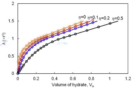 Figure 9b shows a representative model to consider cemented hydrates in one pore. The equivalent radius of the two adjacent particles is calculated by Equation (2). The width of the gap between the two particles is w, and the thickness of the hydrates is h. Then, the volume of the cementing hydrates can be obtained by Equation (5). It is a function of the gap width, hydrate thicknesses, and particle diameter. For a given hydrate saturation in a pore, the volume of cemented hydrates for each contact can be calculated while the thickness of cemented hydrates is unknown. It is difficult to directly obtain an analytical solution from Equation (6). Alternatively, an approximate solution can be obtained by using an iterative method. Thus, the thickness of cemented hydrates can be calculated when the volume of hydrates is given. Figure 10 shows that the approximate solutions agree with the analytical solutions, validating the iterative method.