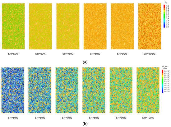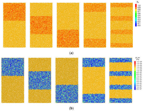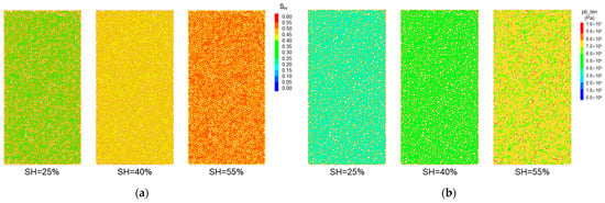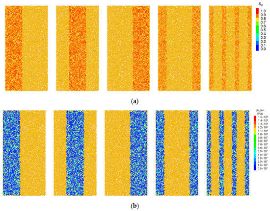 Distributions of hydrate saturation and bond strength in the pore spaces of host sands. (a) Hydrate saturation; (b) tensile strength of bonds. (pb_ten represents the tensile strength of bonds.)