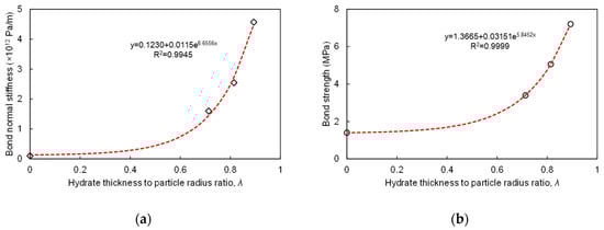 In the parallel bond contact model, the normal stiffness, tangential stiffness, tensile strength, and cohesion of bonds are essential parameters. To reduce the bond parameters, the normal to tangential stiffness ratio of parallel bonds is equal to that of sediments, and the tensile strength of bonds is equal to cohesion. These parameters are functions of the hydrate thickness to sediment radius ratio λ, as shown in Equations (7) and (8).