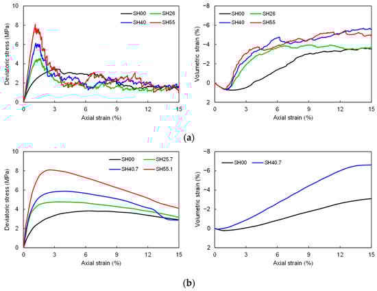 Mechanical responses of HBSs with different hydrate saturations. (a) DEM simulations; (b) experimental results.