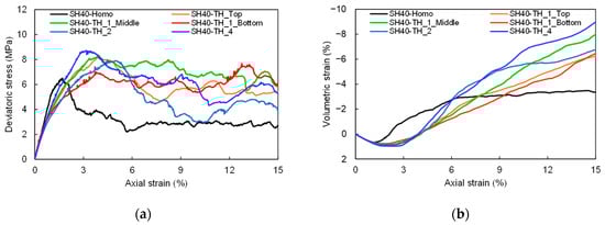 Mechanical responses of transversely heterogeneous DEM specimens. (a) Deviatoric stress response; (b) volumetric strain response.