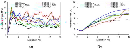 Mechanical responses of longitudinally heterogeneous DEM specimens. (a) Deviatoric stress response; (b) volumetric strain response.