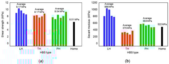 Shear strength and secant modulus of homogeneous and heterogeneous HBSs. (a) Shear strength of different HBS types; (b) secant moduli of different HBS types.