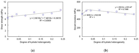Shear strength and secant modulus of pore-scale heterogeneous HBS specimens. (a) Shear strength vs hydrate heterogeneity degree; (b) secant moduli vs hydrate heterogeneity degree.