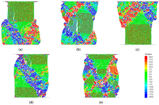 Evolution of particle rotation of transversely heterogeneous DEM specimens under biaxial compression tests. (a) Top hydrate layer; (b) middle hydrate layer; (c) bottom hydrate layer; (d) two hydrate layers; (e) four hydrate layers.
