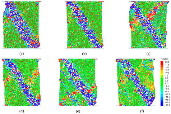 Evolution of particle rotation of microscopically heterogeneous DEM specimens under biaxial compression tests. (a) 50% pore hydrate saturation; (b) 60% pore hydrate saturation; (c) 70% pore hydrate saturation; (d) 80% pore hydrate saturation; (e) 90% pore hydrate saturation; (f) 100% pore hydrate saturation.