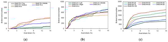 Evolution of the broken bond number of DEM specimens during shearing. (a) Transversely heterogeneous DEM specimens; (b) longitudinally heterogeneous DEM specimens; (c) microscopically heterogeneous DEM specimens.