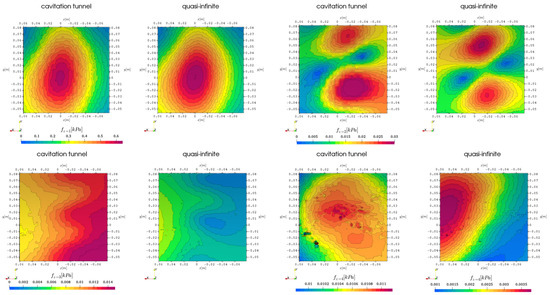 When cavitation takes place, the spatial distribution of the pressure pulses on the same sample surface changes strongly for the first and third harmonic frequency, where a clear separation between the upwards and downwards going blade appears, see Figure 4. The level changes by a factor of two for the first () and second harmonic () and by a factor of four for the third harmonic in the cavitation tunnel domain, while the quasi-infinite domain experiences no change in pressure level. The fourth harmonic frequency again is insignificant in comparison regarding the amplitude and shows overall similar, but mirrored behavior compared to the non-cavitating case for the quasi-infinite domain. Overall, the results are in line with the expected flow behavior, especially compared to the non-cavitating case, because in this case a fluctuating but nearly steady cavitation volume acts as a monopole source on top of the blades, creating sound pressure waves as a result of phase transition leading to the two peaks at the sides. The highest-pressure pulse is belonging to the first harmonic response and takes place directly above the propeller shaftline. The pressure pulse pattern due to the second harmonic excitation seems to experience a shift outward from the ship centerline (-direction), possibly also caused by the additional volume source. The higher harmonics pressure pulse patterns seem to be mostly unaffected by the additional cavitation, however, for the fourth harmonic in the quasi-infinite domain the distribution is mirrored along the diagonal of the evaluation patch.