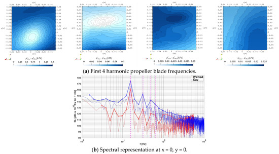 In this analysis, the first four-blade passing frequency harmonics are considered with , as these are the main tonal contributors in the frequency spectrum of a propeller noise and are typically also considered in model test analyses. Even though cavitation is a broadband noise, the frequencies at the blade harmonics are also influenced assuming severe enough cavitation noise. In the low frequencies the dynamics of sheet cavities, depending on their volume variation over a rotation in the wakefield and their associated stability, are dominant, and the high frequencies, on the other hand, are influenced by the stochastic processes driven by the shed smaller cavities and separated single bubbles.