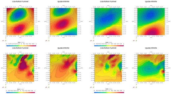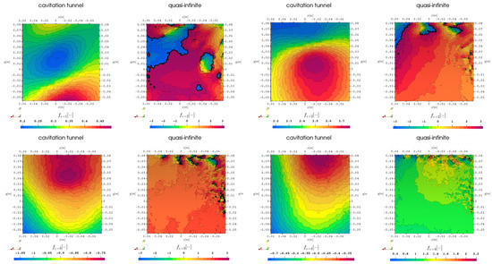 For the following analysis of the hull surface boundary patch above the propeller, the representations direction of travel is to the left, and the outward ship direction is upwards with the first and second harmonic blade passing frequency in the top row and the third and fourth in the bottom row. In Figure 3 the first 4 harmonic propeller blade frequencies are visualized with pressure contour plots for the cavitation tunnel and the quasi-infinite domain for the simulation without cavitation with RANS turbulence modeling. In this representation the direction of travel is to the left, the outward ship is up and the propeller center is located at . The propeller effects for the first harmonic are centered directly above the propeller with pressure pulses of up to , while the second harmonic seems to clearly indicate two peaks above the upwards and downwards going blades and a significantly lower pulse along the shaftline directly above the propeller, which is in agreement with the theory, that the higher harmonics indicate volume variation over the propeller rotation. While the first and second harmonic behavior seems less sensitive to the simulation domain geometry, the third harmonic experiences a slight pressure level shift, however, it has to be considered, that in this case the pressure pulse values are already very low, and the fourth harmonic shows no similarities between the different simulation domains. A possible explanation could be a difference in small-scale turbulent fluctuations in the inflow of the propeller plane between the domains caused by an influence of the interaction with the tunnel walls.