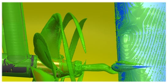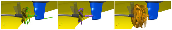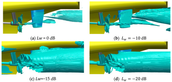 At lower sound powers in Figure 14b, significantly more details appear as possible acoustic sources. These include a clear overlaying waveform structure on the hub vortex isosurface and a cylindrical shape of noise-generating structure between the shaft brackets and the propeller becomes visible. Also, the tip vortex immediately behind the trailing edge is highlighted, which might only be limited in visualization, by the mesh resolution of the underlying FVM fluid flow simulation. With further higher thresholds for the sound power in Figure 14c,d the tip vortex becomes dominant for all angular positions around the -normal plane through the rudder. The noise generated by the vessel appears only in Figure 14c enclosing a part of the stern section and the transom, meaning that a constant noise level is emitted by the vessel itself, which is plausible as the flow around the hull adjacent regions is not influenced by the propulsor and should be less unsteady.