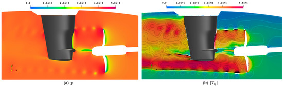 The instantaneous pressure pulse field at a randomly selected timestep is shown in Figure 18 around the propeller hull combination on a midplane through the propeller, with the corresponding instantaneous pressure in Figure 19a around the propeller and the rudder and the Lighthill stress tensor magnitude in Figure 19b. The pressure pulses are a relatively good indicator of noise sources, with the tip vortex and the suction side blades highlighted, as well as the slipstream interaction with the rudder, especially at the lower end, where a trailing vortex from the rudder seems to create rather large acoustic fluctuations, not visible in the isosurface representations in Section 4.3.1. In addition, the downstream interaction with the vessel transom is highlighted here, which is not registered in the other criteria, except Proudman acoustic sources.