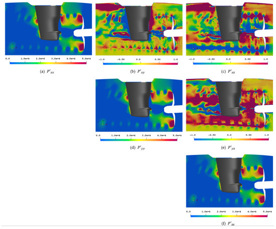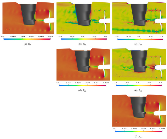 The perturbation stress tensor is deviating from the field on the main diagonal, however, all directional elements , , and show very similar images compared to each other. The off-diagonal elements again feature a colormap that is different from the main diagonal and the previously used one in Figure 20, to show a different range of details. The value range for the main diagonal is , while the value range for the off-diagonal components is . In the off-diagonal components, small-scale fluctuations at the sliding mesh interface upstream of the propeller and a slight level jump at the sliding mesh interface at the other ends of the cylinder are visible. It is clearly distinguishable by the eye where the interface is, even without knowing its exact location in advance.
