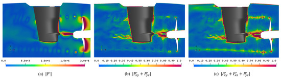 Figure 22 shows the magnitude of all components, which is of course dominated by the main diagonal due to the vastly different value ranges, and the different combinations of off-diagonal components of . With this, important noise features become apparent such as the swirls in the tip vortex in (b) and the clover-leaf structure in (c). Also, this is the only way to visualize the numerical issue of the rotating mesh interface, which can be seen in (b) and (c) between the propeller and the rudder. Additionally, the rudder slipstream is accentuated at the expected angular positions.