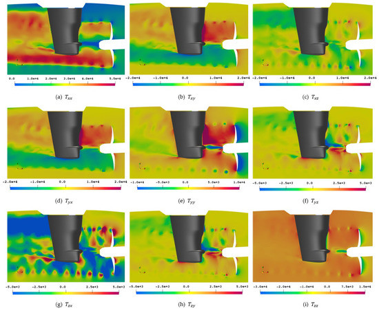 The Lighthill stress tensor is evaluated from the symmetric fluid compressive stress tensor from Equation (13), shown in Figure 20 for reference, which in turn is obtained from the symmetric perturbation stress tensor from Equation (12) in Figure 21. In the figures, the tensor components are sorted according to their location in a matrix, and symmetric tensors are only shown for the upper right side. It has to be noted that the off-diagonal elements experience small value ranges of compared to the main diagonal with only positive values of , meaning that the colormaps are selected to yield the best visualization and sacrifice comparability between tensor elements.