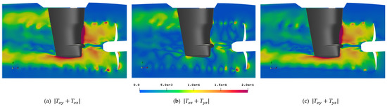 The Lighthill stresses are another useful tool to estimate and evaluate sound emissions, as they highlight the combined noise sources detected by the individual other interpretation tools, i.e., the tip vortex and propeller slipstream rudder interaction.