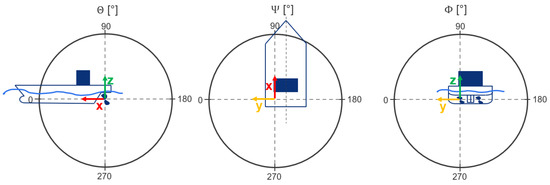 In Figure 29 the complex phase angle with the Fourier-transformed time series obtained by Equation (16) is given on the same rectangular box used in Figure 27 to show the directivity of the phase information to the sea floor, the outside of the vessel and the aft direction, with the transparent propeller-hull combination indicated for orientation. The achieved value range is small with respect to the maximum possible range from , indicating a predominantly monopole-like source behavior of the propeller-hull combination. However, there are interesting patterns visible that require detailed analysis. In the view from below the upwards and downward directions of the blades directly below the propeller are visible, see Figure 29c. That is in line with the results presented in Figure 7 on the hull, and in addition a detuning of the phases around due to the reflections by the rudder in combination with the skeg of the hull on the inwards side and the half field on the right of the plane are clearly identifiable. A distinct phase shift of is visible running across the control surface from the bottom of the rudder to the shaft brackets to the hull along the origin, where the propeller is located, which causes mainly a disparate outward emission to the region in front of the propeller and behind it. In the aft view the detuning by the contained region between the rudder and the skeg of the hull by comparing the half-planes with respect to is again visible. In addition, the turbulent slipstream of the propeller-rudder combination produces a range of phases with a difference of maximum , which again considering the complete possible value range of the complex phase angle is surprisingly small, however, the chaotic nature of the turbulent mixing is visible in the phases of the sound source representation on the passive surface as well. Comparing this slipstream appearance with the one on the spheres from Figure 28, which intersects mid-rudder and shows a high degree of order, it is clear that the interaction of the propeller slipstream with the rudder creates this chaotic phase emission characteristic downstream.