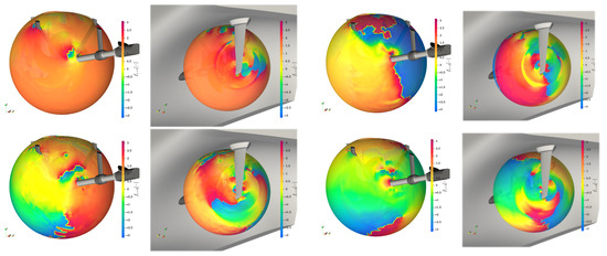 Besides the amplitude information, the phases are of interest in the far-field emissions, if the interaction with other noise sources or reflections from the environment is part of the problem. In Figure 28 the complex phase angle from Equation (17) is plotted as a contour on the sphere presented in Figure 26 and shown isometrically from the upstream direction with the shaftline and from the downstream direction with the vessel and the rudder for the first four propeller blade harmonics , respectively. As proposed before the rudder and skeg act as reflection boundaries that detune the phase, when comparing inwards and outwards directed emissions, which is particularly visible for the higher harmonics with a phase difference of around between inwards and outwards directed sound. For the first harmonic the area on the sphere is slightly smaller with only the upwards-directed surfaces on the inwards side showing the phase shift, while otherwise the emission features a uniform phase. The tip vortex radii intersection in the downstream direction at is distinct for all harmonics, with the higher harmonics increasing the effect radially.