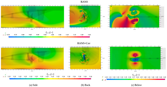 Another suggestion is to use the pressure second order statistical moments to locate noise sources as illustrated in Figure 15 for several isovalues, which succeeds in highlighting important pressure-based flow features as well as deficiencies in the numerical simulation approach, in particular the sliding mesh approach. It has to be noted that the isosurfaces outside of the sliding mesh are time-invariant once a sufficient number of sample data is exceeded, while inside the rotating mesh region isosurface structures are moving with the propeller such as the tip vortex. The sliding mesh interface is apparent in Figure 15b,c between the propeller and the shaft brackets, and the rudder, respectively. In Figure 15a there are four distinct lobes from the propeller plane upstream on the isosurface, which may indicate a quadrupole noise source of the propulsor or be a result of the interaction with the shaft brackets and the vessels tunnel shape to improve propeller inflow. Especially the tunnel shape is responsible for a large downward extent of the hull boundary layer and thus strong interaction with the propeller as described above.