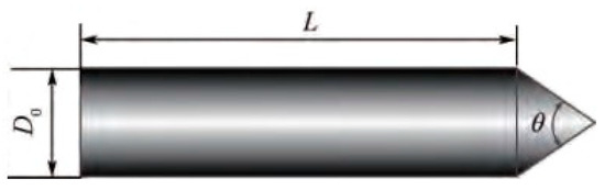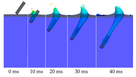 According to the above free surface model, the water-entry process of a rotating body was numerically simulated and the numerical results were compared with experiments [28] to verify the accuracy and effectiveness of the numerical method. The shape of the water-entry object is shown in Figure 3. The diameter of the rotating body was D0 = 9 mm, the length of the column section was L = 40 mm and the head was θ = 140° taper head type. The experimental model was made of ordinary steel with density ρ = 7.85 g/cm3. The initial inclination of the rotating body was 55° and the initial water-entry velocity was 4.35 m/s. The velocity direction of the rotating body was along the axis of the rotating body. Figure 4 shows the comparison between the experimental image and the simulation image of the inclined water-entry process of the rotating body. Figure 5 shows the comparison of the velocity of mass center and inclination angle.