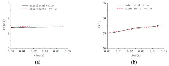 After establishing the response surface function model, given any group of inclination angle and velocity, the pitch angle of submersible aerial vehicles at the end of the water-exit process can be obtained. Next, the fitting function relationship established above is verified. When the initial inclination angle x1 is 8° and the initial velocity x2 is 14 m/s, using Equations (11) and (12) and relying on the established fitting function relationship, the predicted pitch angle and velocity are 27.56°and 7.39 m/s. The simulation calculation results are 27.27° for the pitch angle and 7.6 m/s for the velocity. The errors are less than 2.7%, so the correctness of the established fitting function relationship is verified.