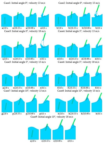 To investigate the influence of initial inclination angle and launching velocity on the motion characteristics of the submersible aerial vehicle, we simulated the cross-medium water-exit process of submersible aerial vehicles under the conditions of different velocities and inclination angles. Images of a missile’s water-exit motion for the 9 cases considered are shown in Figure 6. With the movement of the missile, the missile head emerges from the water and the missile body crosses the water–air medium into the air. The wave beats the missile, causing disturbance to the missile’s water-exit process. The missile speed decreases, the free surface gradually breaks and, finally, the missile flies out of the water completely.