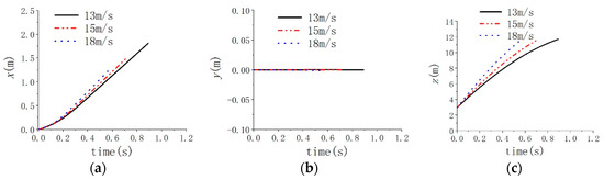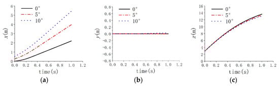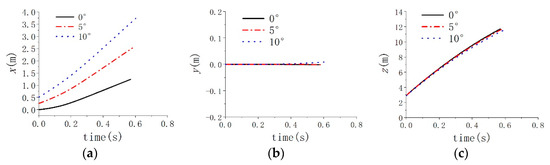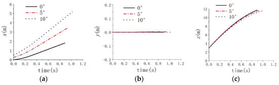Figure 7, Figure 8 and Figure 9 show the comparison of mass center displacement of submersible aerial vehicles under three different inclination angles. Table 2 shows the centroid coordinates of the vehicle. Due to the influence of waves on the process of submersible aerial vehicle water-exit—the load fluctuation caused by cross-medium—the submersible aerial vehicle vibrates slightly in the X and Y directions. Under the condition of the same velocity and wave level at the time of flying out of the water, the displacement of the submersible aerial vehicle with an inclination angle of 10° is greater than that of 5° in the X direction and the displacement of the submersible aerial vehicle with an inclination angle of 5° is greater than that of 0° in the X direction. The displacements of submersible aerial vehicles in the Y direction are very small (<0.018 m) and the displacements in the Z direction are similar under the conditions of inclination angles of 10°, 5° and 0°.
