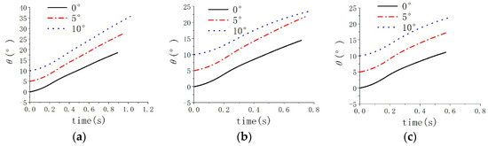 Figure 13, Figure 14 and Figure 15 show the attitude angle of submersible aerial vehicles during the process of submersible aerial vehicles flying out of the water. The pitch angles of the vehicle under various cases are shown in Table 3. The pitch angle at the time when the vehicle exits the water with an initial inclination of 10° is greater than the pitch angle with an initial inclination of 5° and the pitch angle at the time when the vehicle exits the water with an initial inclination of 5° is greater than the pitch angle with an initial inclination of 0°. As such, the inclination angle of 0° is more favorable to the vehicle’s water-exit process than 5° and the inclination angle of 5° is more favorable to the vehicle’s water-exit process than 10°.