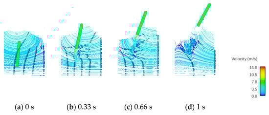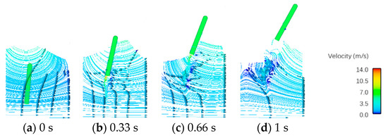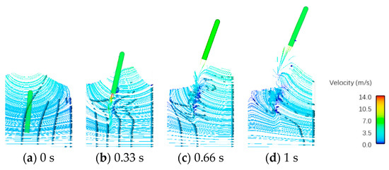According to Figure 16 and Figure 17, we can find that the underwater streamline moves to the right, the wave force on the vehicle moves to the right and the vehicle deflects to the right, leaving the water surface under the action of the wave. The flow velocity at the wave crest is the largest in the flow field distribution. During the motion of the vehicle in the water, vortices form at the tail of the vehicle, which makes the flow field near the vehicle change dramatically. The streamline velocity at the tail of the vehicle is greater than that of the surrounding flow field.
