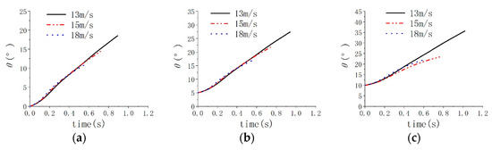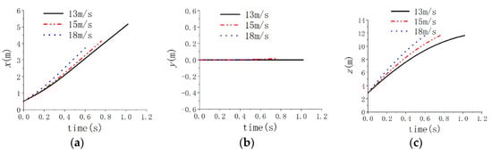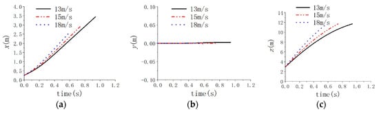 Figure 19 show the attitude angle of submersible aerial vehicle during the process of submersible aerial vehicles flying out of the water; the pitch angle of submersible aerial vehicles changes more at 13 m/s than at 15 m/s and the pitch angle of submersible aerial vehicles changes more at 15 m/s than at 18 m/s. As such, the water outlet velocity of 18 m/s is more favorable to the vehicle’s water-exit process than 15 m/s and the water outlet velocity of 15 m/s is more favorable to the vehicle’s water-exit process than 13 m/s. Thus, at the same initial inclination angle, the larger the initial velocity, the smaller the displacement and attitude angle changes of the submarine-launched vehicle [29].