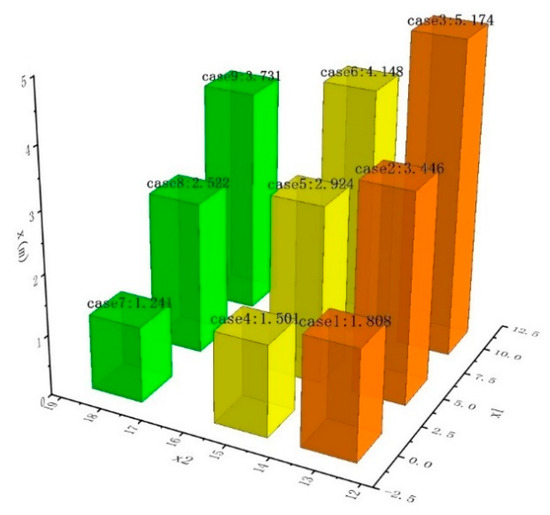 Figure 14, Figure 15 and Figure 16 show the comparison of mass center displacement of submersible aerial vehicle under three different velocities of water-exit. We can find that the displacement of the submersible aerial vehicle in X direction with a velocity of 13 m/s is greater than that of 15 m/s and the displacement of the submersible aerial vehicle in X direction with a velocity of 15 m/s is greater than that of 18 m/s, under the condition of the same inclination angle and wave level at the time of flying out of the water. In order to make a careful comparison, the vehicle centroid X-axis coordinates at the end of the water-exit process of 9 cases, with respect to the different initial inclination angle x1 and water-exit velocity x2, are shown in Figure 17. The displacements of submersible aerial vehicles in the Y direction are very small. The displacement of submersible aerial vehicles with initial velocities of 13 m/s, 15 m/s and 18 m/s are similar in Z direction.