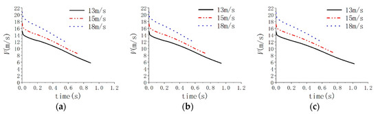 Images of axial velocity variation of vehicles under different initial velocities. (a) Axial velocity of vehicle in case 1, 4, 7. (b) Axial velocity of vehicle in case 2, 5, 8. (c) Axial velocity of vehicle in case 3, 6, 9.