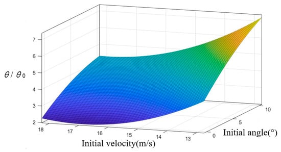 It is necessary to analyze the stability of submarine aerial vehicles [30] in water-exit movement. The pitch angle plays an important role in the stability of a submersible aerial vehicle’s trans-medium motion. The trans-medium motion stability fitting function model of a submersible aerial vehicle is established based on the response surface model using the simulation data. Equation (11) represents the expression of the relationship between the pitch angle θ and both the inclination angle x1 and the water-exit velocity x2, when the wave-exit position is at the wave crest and the reference inclination angle is θ0 = 5°, as shown in Figure 22.